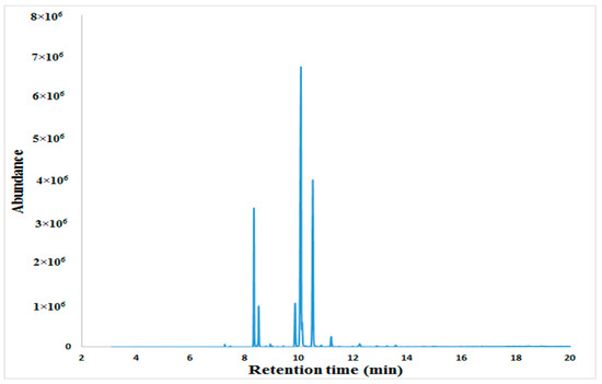 The composition of the biodiesel achieved by transesterification of WCO using the best catalyst, TiO2-0.5Li, is shown in Figure 5. The FAME profile of the current sample was recognized with the support of the National Institute of Standards and Technology (NIST) 2014 Mass spectral (MS) library and described in Table 4.