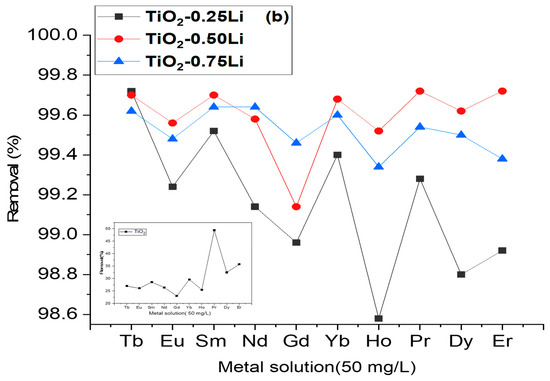 The adsorption studies were performed using various nanomaterials such as TiO2, TiO2-LiOH (1:0.25, 1:0.5, and 1:0.75 molar ratios), and 50 mg/L of each REE solution with continuous mixing of samples at 250 rpm at 25 °C for 120 min. The adsorption capacity of different nanomaterials is illustrated in Figure 7. All nanomaterials showed adsorption efficiency of REEs, and the maximum adsorption capacity of nanomaterials was in the following order: TiO2-0.5Li > TiO2-0.75Li > TiO2-0.25Li > TiO2-0.5Li. The maximum adsorption of REEs was observed by TiO2-0.5Li, probably due to the monoclinic crystal lattice and high basic strength of the catalyst [9,21,22,23].