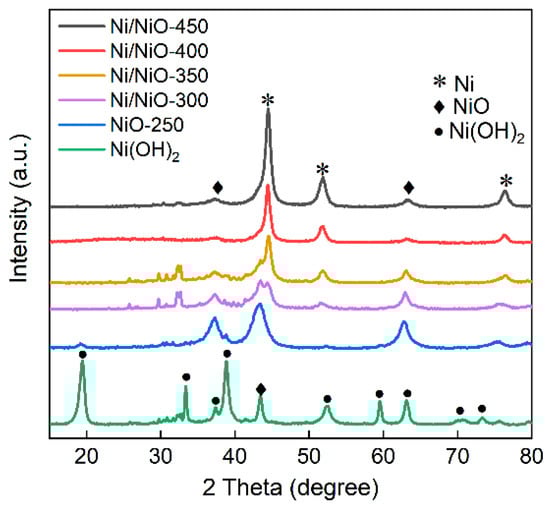 Ni/NiO nanocomposites: The dried precursor was then calcined in a furnace at different calcination temperatures under flowing 10 vol % H2/He (100 mL min−1) for 2 h. In this study, the reduction temperature ranged between 250 °C and 450 °C. The obtained nanocomposites were named Ni/NiO-T (T represents the reduction temperature). By regulating the reduction temperature, we obtained sample NiO-200, NiO-250, Ni/NiO-300, Ni/NiO-350, Ni/NiO-400, Ni/NiO-450.