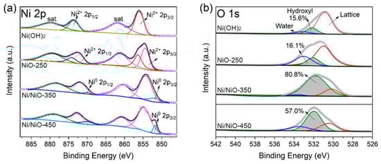 The mixture of metallic Ni and nickel oxide of the as-synthesized samples was confirmed by X-ray photoelectron spectroscopy (XPS). Figure 4 shows the XPS spectra of the as-synthesized Ni/NiO nanocomposites. The two peaks at ~855eV and ~872eV were assigned to the 2p3/2 and 2p1/2 of Ni. The two satellite peaks at ~862eV and ~880eV represent the main peak and satellite peak of Ni2+ 2p1/2, respectively, indicating that the existence state of Ni in the two samples is only Ni2+, which exists in the form of Ni(OH)2 or NiO. For Ni/NiO-350, the binding energy values of ~853 eV and ~871 eV were observed, corresponding to Ni0 2p3/2 and 2p1/2, respectively []. This result confirms that the surface of the Ni/NiO-350 sample consists of both Ni0 and NiO. Under reduction conditions in a H2 atmosphere, the Ni(OH)2 precursor was reduced to the NiO intermediate in 250 °C, then the generated NiO intermediate was further reduced to Ni at 350 °C, but a thin NiO layer remains due to re-oxidation in air. After reduction at 450 °C, Ni nanoparticles agglomerate to form large Ni particles and the products lose the sheet-like shape.