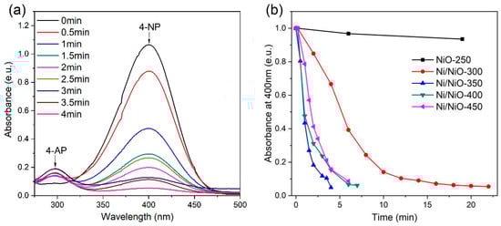 The catalytic activity of the nanosheet Ni/NiO composite was evaluated using hydrogenation of p-nitrophenol by NaBH4. Pure Ni nanocrystals show limited activity for catalyzing the hydrogenation reaction from p-nitrophenol to p-aminophenol []. This reaction process could be monitored by scanning the light absorption profile of the solution. In this study, the peak intensity at 400 nm is selected to represent the concentration of p-nitrophenol, while the intensity at 300 nm stands for the concentration of p-aminophenol. As shown in Figure 5a, by adding the Ni/NiO-350 catalyst to the p-nitrophenol solution containing NaBH4, the absorption band at 400 nm gradually weakened, while a new band at 300 nm appeared. Because the light absorption coefficients of AP and NP are different, the variation in absorbance peak does not match. The evolution in light absorption is widely adopted in the literature to reflect the hydrogenation reaction where the p-nitrophenol molecule is directly translated into the p-aminophenol [,] Within 5 min, the conversion of p-nitrophenol achieved 100% over the Ni/NiO-350 sample. Figure 5b shows the evolution of nitrophenol concentration over different Ni/NiO nanocatalysts. It was found that the reactivity of nanocomposites follows: NiO-250 < Ni/NiO-300 < Ni/NiO-450 < Ni/NiO-400 < Ni/NiO-350.