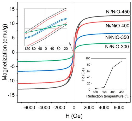 As the metallic Ni is included in the final products, they exhibit room temperature ferromagnetism that facilitates recovery of the catalyst after the catalytic reaction and recycling. Figure 6 depicts the room-temperature magnetic hysteresis loop of the 2D Ni/NiO nanocomposites. The saturation magnetization (MS) of the Ni/NiO nanocomposites ranges from 6.7 emu g−1 to 12.7 emu g−1, and the coercive force (Hc) ranges from 7.5 Oe to 91.7 Oe. The Ni/NiO composite obtained by hydrogen reduction has a large MS and Hc. For composite materials, MS is related to the content of the magnetic phase []. In this work, the presence of Ni nanoparticles in the Ni/NiO composite microstructure leads to a high MS.