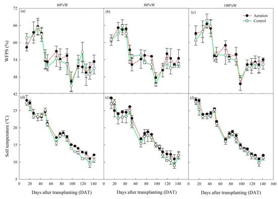 Soil water-filled pore space (WFPS) (a,b,c) and soil temperature (d,e,f) with and without aeration under the irrigation level of 60%W (a,d), 80%W (b,e), and 100%W (c,f) (mean ± SD, n = 3). W refers to full irrigation.