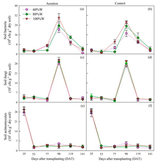 The abundance of soil bacteria (a,b), fungi (c,d), and actinomycetes (e,f) with the irrigation level of 60%W, 80%W, and 100% W under the aeration (a,c,e) and control (b,d,f) (mean ± SD, n = 3).