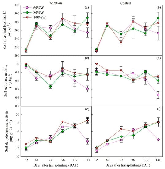 Soil microbial biomass carbon (a,b), soil cellulase activity (c,d), and soil dehydrogenase activity (e,f) with the irrigation level of 60%W, 80%W, and 100%W under the aeration (a,c,e) and control (b,d,f) (mean ± SD, n = 3).