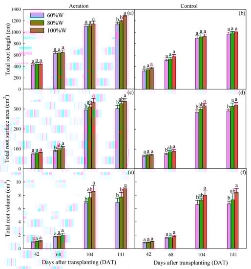 Total root length (a,b), surface area (c,d), and volume (e,f) with the irrigation level of 60%W, 80%W, and 100%W under the aeration (a,c,e) and control (b,d,f) (mean ± SD, n = 3).