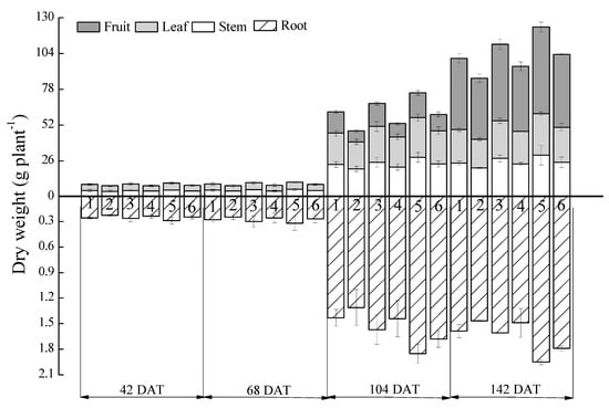 Dry biomass of tomato fruit, leaf, stem, and root among treatments on 42, 68, 104, and 142 days after transplanting (DAT). The number 1, 2, 3, 4, 5, and 6 represented treatment of 60%W with aeration, 60%W without aeration, 80%W with aeration, 80%W without aeration, 100%W with aeration, and 100%W without aeration, respectively.