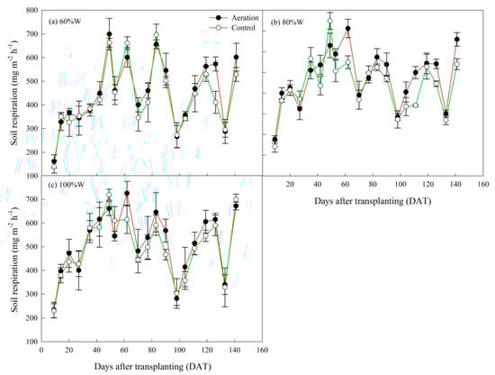 Soil respiration with and without aeration under the irrigation level of 60%W (a), 80%W (b), and 100%W (c) (mean ± SD, n = 3).