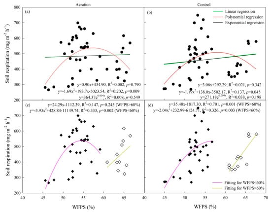 Correlation between soil respiration with soil water-filled pore space (WFPS) for the all WFPS data (a,b) and data with WFPS piecewise analysis (c,d). (a)(c) and (b)(d) represented correlation under the aeration and control, respectively.
