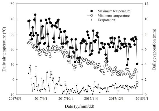 Daily evaporation measured by an E601 evaporation pan is shown in Figure 8. In all growth stages, 20 irrigation events were applied every seven days, with a total irrigation amount for W of 19.80 L per plot [31]. Irrigation amount was determined following the Equation (1) [9,10,42]: