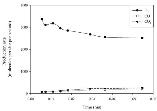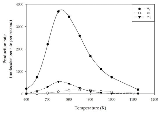 Figure 7 demonstrates the production rates as a function of the reaction temperature. The results suggest that the production rates of H2 and CO2 are the highest at 750–800 K, whereas the production rate of CO exhibits the highest values at a temperature range of 800–900 K. Therefore, at around 800 K, the reaction should provide the highest yield of syngas (3439 molecules/site/second for H2 and 161 molecules/site/second for CO). From the simulation, at a temperature higher than 750 K, the fractional coverages of C* and H* decrease, as well as O*, possibly because of the increasing of the H2, CO, and CO2 formation rates.