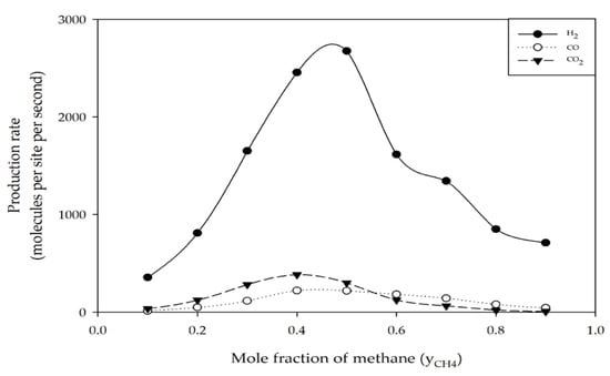 Production rates as a function of the mole fraction of methane; T = 823 K and P = 1 bar.