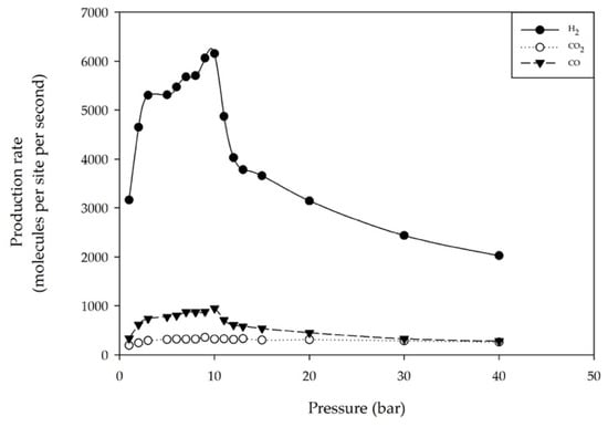 As mentioned in the previous study [43], the steam reforming reaction is not favored thermodynamically at high pressures. The effect of the total pressure is studied by varying the total pressure from 1 to 40 bar at = 0.5. As shown in Figure 8, the production rates are remarkably increased with increasing the total pressure up to 10 bar. However, when the total pressure is higher than 10 bar, the production rates are notably decreased.
