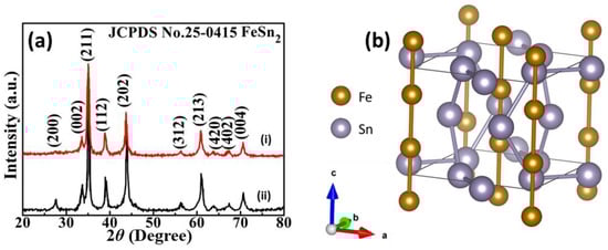 (a) XRD patterns of (i) FeSn2/onion-like carbon (FeSn2/OLC) nanocapsules and (ii) FeSn2 nanoparticles. (b) Crystal structure of FeSn2.