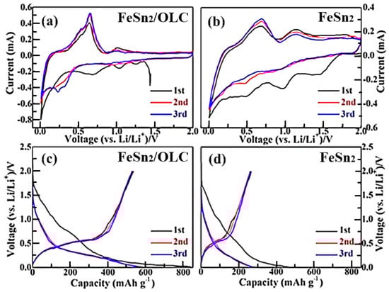 Cyclic voltammetry (CV) curves of LIB cells at the initial three cycles using (a) FeSn2/OLC nanocapsule-based anodes and (b) FeSn2 nanoparticle-based anodes. Galvanostatic charge‒discharge curves of LIB cells at the initial three cycles using (c) FeSn2/OLC nanocapsule-based anodes and (d) FeSn2 nanoparticle-based anodes.