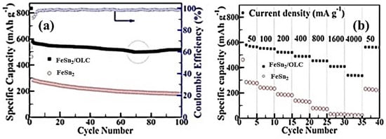 (a) Cyclic stability of LIB cells at a specific current density of 50 mA·g−1 using FeSn2/OLC nanocapsule-based anodes and FeSn2 nanoparticle-based anodes. (b) Rate of performance of FeSn2/OLC nanocapsule-based anodes and FeSn2 nanoparticle-based anodes.