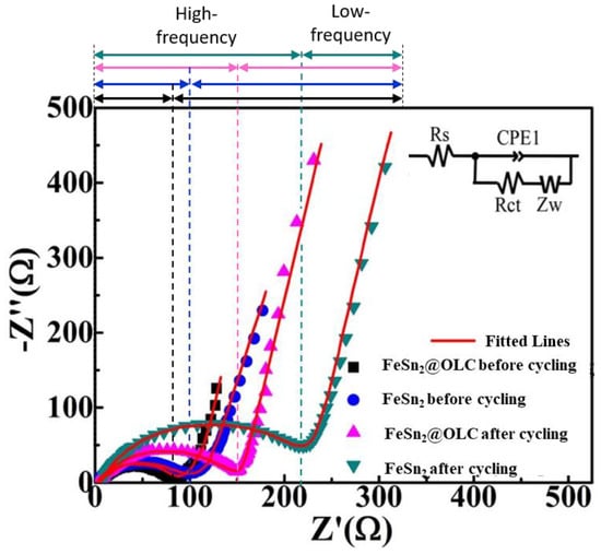 As shown in Figure 5, the EIS was carried out to investigate the electrochemical properties of the active materials: FeSn2/OLC nanocapsule-based anodes and FeSn2 nanoparticle-based anodes in LIB cells. Subsequently, the Nyquist plots were fitted with ZView software. The equivalent circuit model was composed of the following parameters: Rs (ohmic resistance), Rct (interface charge transfer resistance), CPE (constant phase element), and Zw (Warburg impedance). The high frequency intercept on the real axis represents Rs arising from the electrolyte and electrode resistances. Rct is the resistance during transfer of electrons from electrode to electrolyte. CPE is attributed to the double layer capacitance imparted by the SEI layer. Zw represents the finite diffusion of the electrons through the anode [36,37]. Owing to increased electrical conductivity and reduced volume expansion in the FeSn2/OLC nanocapsule-based anodes, they feature a lower Rs than the FeSn2 nanoparticle-based anodes, both before and after cycling [33]. The lower Rct of the FeSn2/OLC nanocapsule-based anodes facilitates faster Li+ ions diffusion and electron transfer, consequently enhancing the cycling performance even at high current densities.