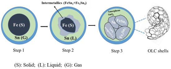 From the observations of the physicochemical results of the FeSn2/OLC nanocapsules, we have theoretically proposed the formation mechanism of FeSn2/OLC nanocapsules during the arc-discharge process. The arc-discharge method scores over the conventional thermal evaporation method in terms of its capability to produce supersaturated atomic hydrogen. The hydrogen not only provided the required heat, but also enabled the formation of tiny bubbles in the molten Fe-Sn alloy. Considering the low inner pressure of the bubbles, they could be approximated as evaporating source in the vacuum. When the surrounding bulk melts and evaporates from the bubble boundary, the bubbles assume an oversaturated state. Finally, the over-saturated vapors escape from the surface of the Fe-Sn molten alloy to form intermetallic nanoparticles. Since the evaporation rates of Fe and Sn at 1873 K are 1.61 and 47.69 g·cm−2·h, respectively, the Sn content in the nanoparticles is much higher than the Fe [26].