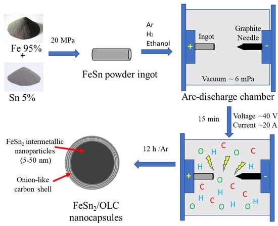 Schematic representation of formation of FeSn2/OLC nanocapsules during in-situ arc-discharge process [20,26].