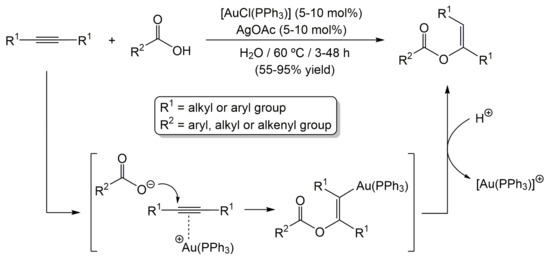 Enol esters represent an important class of synthons in organic chemistry, commonly employed as intermediates, among others, in cross-coupling [1,2,3], asymmetric hydrogenation [4,5,6], and cyclization reactions [7,8,9], as well as monomers in polymerization and oligomerization processes [10,11,12]. Among the different methods of synthesis of these valuable molecules, the intermolecular addition of carboxylic acids to alkynes catalyzed by transition metals (hydro-oxycarbonylation reaction) is probably the most straightforward and atom-economical one because the starting materials are widely available and no byproducts are generated in the process. A large number of catalytic systems, mainly involving Groups 8–11 metals, have been reported in the literature, with those based on ruthenium being probably the most popular [13,14,15,16,17]. However, the vast majority of studies have focused on the hydro-oxycarbonylation of terminal alkynes. Examples of the intermolecular addition of carboxylic acids to internal alkynes still remain scarce [18], and in most of the cases, only activated substrates, such as trifluoromethylated alkynes [19], acetylenic esters [20], ynol ethers [21], ynamides [22], or iodoalkynes [23], have been considered. For nonactivated internal alkynes, only a very limited number of gold- and cobalt-based catalysts have proven effective under mild conditions (temperatures below 100 °C) [24,25,26,27]. It is also worth noting that, despite the growing interest in developing catalytic transformations in environmentally friendly aqueous media [28], efforts devoted to finding catalytic systems able to promote the hydro-oxycarbonylation of alkynes in water have been very scarce, with most of the examples dealing with intramolecular processes [29]. In fact, the only protocol for the intermolecular addition of carboxylic acids to internal alkynes in water that can be currently found in the literature was developed by our group, making use of the gold(I) complex [AuCl(PPh3)] in combination with the chloride abstractor AgOAc [30]. As shown in Scheme 1, the trisubstituted enol ester products were generated with complete Z-stereoselectivity as the result of the anti-addition of the carboxylate anion to the corresponding cationic π-alkyne-Au(I) intermediate.