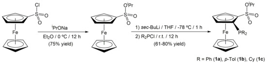 Synthetic route employed for the preparation of the ferrocenyl sulfonate ligands 1a–c.