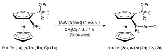 3.1. General Procedure for the Preparation of Complexes [AuCl{(η5-C5H3PR2(SO3iPr))Fe(η5-C5H5)}] (R = Ph (2a), p-Tol (2b), Cy (2c))