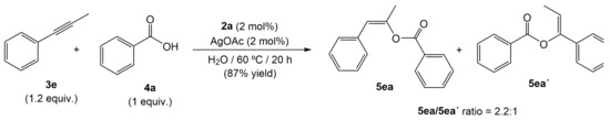 To complete the study, the catalytic addition of benzoic acid (4a) to a nonsymmetrically substituted alkyne, i.e., 1-phenyl-1-propyne (3e), was finally explored. As shown in Scheme 5, the reaction proceeded in high yield after 20 h, but with a relatively low regioselectivity. Thus, a nonseparable mixture of the regioisomeric enol esters 5ea and 5ea´ was formed in ca. 2.2:1 ratio.
