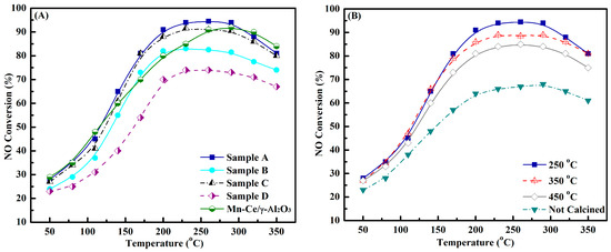 For different samples calcined at 250 °C, the low-temperature SCR removal activity, and N2 selectivity at different reaction temperatures, are shown in Figure 1A and Table 1, respectively. It can be seen that sample A exhibited the best activity and selectivity among other samples in a wide temperature range with NO conversion above 90% from 200–290 °C and the N2 selectivity above 90% up to 250 °C.