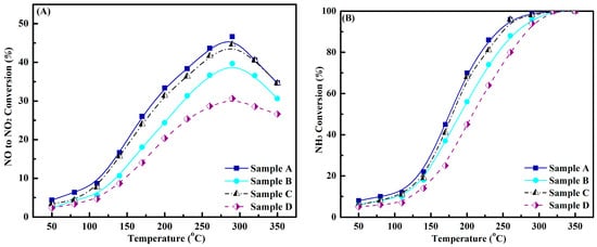It was reported that with the increase in the NO2/NO molar ratio in the feeding gas fast SCR reaction: NO + NO2 + 2NH3→2N2 + 3H2O could be promoted, which can significantly boost the low-temperature SCR activity of the catalyst [16,22]. That is why separate NO oxidation activities of the different samples were tested and the results are demonstrated in Figure 2A.