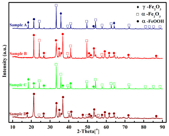 XRD patterns of the different iron ore samples without calcination are shown in Figure 3. It can be seen that the samples consist of three minerals of iron: γ-Fe2O3 (maghemite, JCPDS 00-39-1346), α-Fe2O3 (hematite, JCPDS 01-089-8104) and α-FeOOH (goethite, JCPDS 00-017-0536).