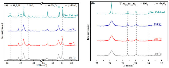 Partly magnified XRD spectra of the ‘not calcined’ as well as ‘calcined’ sample A at different temperatures is shown in Figure 4. Sample A without calcination exhibited sharp crystalline peaks of α-Fe2O3 and γ-Fe2O3, indicating good crystallinity (Figure 4A). After calcining the sample to 250 °C, both phases of the Fe2O3 were still intact, but the intensities of the peaks were much lower, indicating a poor crystallinity (amorphous structure formation verified by SEM) which was beneficial for obtaining high SCR activity at low temperatures. However, with a further rise in calcination temperature above 250 °C, the γ-Fe2O3 phase (peak at 63.99°) in the sample has been converted into the α-Fe2O3 phase (peak at 64.17°). Cao et al. also concluded that after increasing the calcination temperature above 250 °C, the γ-Fe2O3 particles started to engulf their surrounding crystals and the different sizes of the α-Fe2O3 particles formed [25], which resulted in the decrease of surface area. According to the Scherrer formula (Equation (5)), the half-width of the diffraction peak and the crystallite size of the material are inversely proportional to each other. So, the average crystallite sizes of the sample that was calcined at 350 °C and 450 °C, respectively are larger than the sample calcined at 250 °C, which could be related to the sintering (frittage) phenomenon at higher temperatures and the formation of α-Fe2O3. That is why the samples calcined at a higher calcination temperature (350 °C, 450 °C) exhibited lower catalytic activity and selectivity than the sample calcined at 250 °C (Figure 1, Table 1).