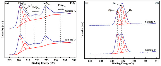 XPS spectrum of (A) Fe2p; (B) O1s of sample A and sample D, calcined at 250 °C.