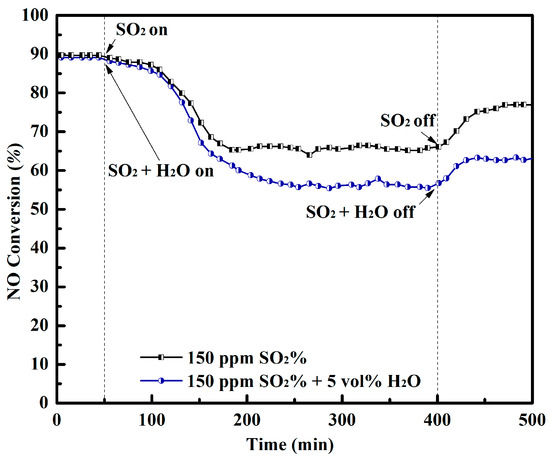 The influence of SO2 and H2O on the SCR activity was investigated at 200 °C (Figure 8). To test SO2 tolerance, 150 ppm SO2 was added to the simulated flue gas after 50 min of stable reaction. It can be seen that the NO conversion showed a negligible decrease and the NO conversion still remained above 85% after 100 min. However, the NO conversion decreased from 85% to 65% in 200 min, and after that, the NO conversion became almost stable. When the SO2 feed was stopped after 400 min, the NO conversion was restored to some extent. Compared with the previous reports [41,42], our experiments exhibited that the iron ore sample had better tolerance to SO2 at 200 °C in one hour of added SO2. However, after this time, substantial deactivation occurred due to the formation of sulfates on the surface of the catalyst, which resulted in a sharp decrease in NO conversion. The coexistence of H2O and SO2 led to more catalyst deactivation to the addition of a single gas (SO2), because H2O can compete with the gaseous NH3 for the active sites [43]. When 5 vol % H2O and 150 ppm SO2 were added to the simulated flue gas after 50 min of stable reaction, the synergy effects of the H2O and SO2 could be seen on the NO conversion of the iron ore catalyst.