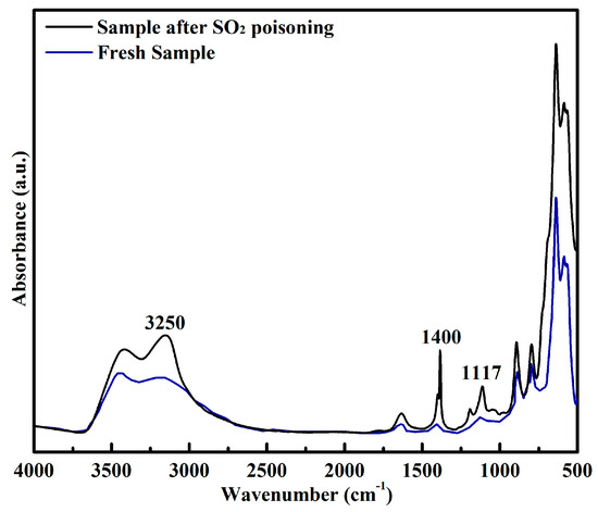 To authenticate the formation of ammonium sulfates the FT-IR analysis of the fresh and the deactivated sample was carried out, and the results are shown in Figure 9. By comparison, some new bands at 1117, 1400 and 3250 cm−1 were found in the spectra of the sample poisoned by the SO2 gas. The new bands at 1117 and 1400 cm−1 are credited to the adsorption peak of SO42- [44,45], whereas, the band at 3250 cm−1 is ascribed to the corresponding N–H stretching vibration of NH4+ ions [42]. These results showed that sulfate salts such as (NH4)2SO4 and NH4HSO4 were formed during the SCR reaction on the iron ore sample, which could cause pore plugging and result in a reduction of the catalytic activity.