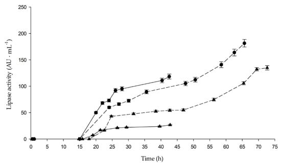 The differences were more appreciated when Methanol limiting fed-bath (MLFB) strategy was employed for comparing both strains. After the transition phase, the rROL production was practically negligible for all the µ set-point tested, except for the lowest µ in which a sharp increase of lipolytic activity was observed at the end of the fed-batch culture [38]. When the MLFB strategy was studied with proROL-strain, a different behavior was observed at the lowest (0.015 h−1) and the highest (0.045 h−1) µ set-points (Figure 1). In fact, even if proROL-strain production parameters were lower in MLFB strategy than in MNLFB one, they were higher for the two µ set-points tested when compared with rROL-strain—4.4 times greater in the best case—as can be seen in Figure 1 and Table 2. As it was described for rROL-strain, MLFB cultures at the lowest µ improved the titer [38].
