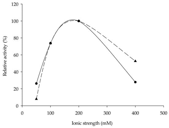 proROL was characterized in biochemical terms to examine the influence of ionic strength, temperature, and pH on enzyme activity, as well as to compare the results with those previously reported for rROL [40]. As shown by reported evidence, ionic strength has a marked effect on enzyme activity. In this work, its influence was examined by using 50–400 mM concentrations of Tris-HCl buffer at pH 7.25. As expected, lipolytic activity (Figure 3) was strongly influenced by ionic strength because the activity dropped dramatically at 400 mM and 50 mM. Both enzymes behaved similarly in this respect, suggesting that the presence of the prosequence had no appreciable effect on this parameter.