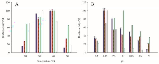 (A) Effect of temperature on lipolytic activity relative to the maximum value for proROL and rROL in Tris-HCl buffer at pH 7.25 at two different ionic strengths (200 and 400 Mm) that were taken to be 100% in each case. (B) Effect of pH on lipolytic activity relative to the maximum value for proROL and rROL in Tris-HCl buffer at 30 °C at two different ionic strengths (200 and 400 mM) that were taken to be 100% in each case. (dark-blue) 200 mM proROL. (striped-red) 400 mM proROL. (green) 200 mM rROL. (White) 400 mM rROL.