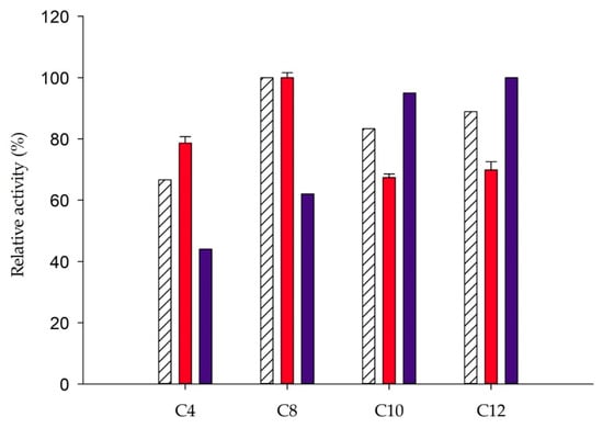 C-4 to C-12 p-nitrophenol ester specificity for nROL (striped-white), proROL (red), and rROL (dark-blue). The maximum activity at 30 °C in 50 mM phosphate buffer at pH 7 in each run was taken to be 100%.