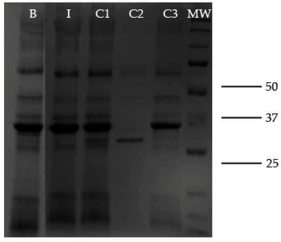 Previous studies confirmed the proteolysis of the N-terminal in purified Rhizopus niveus lipase [41], whose N-terminal is identical with that in R. oryzae lipase [43]—seemingly, proteolysis was the result of the presence of a serine protease in the purified lipase solution. Taking this into account, the proROL enzyme was left in the solution for 24 h at room temperature to evaluate, by SDS-PAGE, possible proteolysis and compare it with the controls described in Section 3.10. As can be seen from Figure 6, proROL (C2) lost the 28 amino acids of the prosequence. However, no proteolysis was observed in the presence of the protease inhibitor under sterile conditions (C3). Moreover, proteolysis was less marked with C1 as the likely result of an antiseptic effect of ethanol added to the proROL solution.