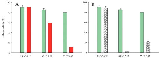 These results led us to examine proROL further than rROL by extending the incubation time to 24 h under sterile conditions to avoid the unwanted proteolysis described in Section 2.5. As can be seen in Figure 7B, proROL lost only 10% of its activity after 24 h of incubation at 25 °C and pH 8.12. Therefore, the temperature had a stronger effect than pH on proROL stability, which is consistent with the results of previous studies on rROL stability [5].
