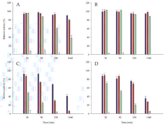 Stability of proROL and rROL in solution in the presence of ethanol and methanol at four different concentrations. (A) proROL in ethanol, (B) proROL in methanol, (C) rROL in ethanol, and (D) rROL in methanol. Activity values relative to t = 0. Alcohol concentration: 0% (black), 5% (striped-white), 15% (gray), and 30% (white).