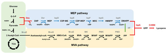 Lycopene can be biologically synthesized through condensation of two precursors, isopentenyl pyrophosphate (IPP) and dimethylallyl diphosphate (DMAPP), and subsequent chain elongation reactions (Figure 1) [19,20]. The two precursors, IPP and DMAPP, are produced via two distinct pathways [21]. One of the pathways is the mevalonate (MVA) pathway, which is mainly present in eukaryotes and archaea. The MVA pathway utilizes three moles of acetyl-CoA to synthesize one mole of IPP, which is then isomerized to DMAPP by the activity of isopentenyl-diphosphate delta-isomerase (Idi). The other pathway is the 2-C-methyl-d-erythritol 4-phosphate (MEP) pathway, which is mostly present in bacteria and consists of a series of reactions initiated by the condensation of pyruvate and glyceraldehyde-3-phosphate (G-3-P). Although the MEP pathway requires more energy (ATP) and cofactors (NADPH) to synthesize IPP than the MVA pathway [13], the direct use of the two C-3 glycolytic intermediates enables MEP pathway to have a 1.48-fold higher IPP yield (0.83 C-mole/C-mole) than the MVA pathway (0.56 C-mole/C-mole) [13,22]. Since most bacteria showing fast growth inherently possess the MEP pathway for synthesizing their building blocks [21], the MEP pathway has been widely utilized in recent studies for lycopene production [10,23].