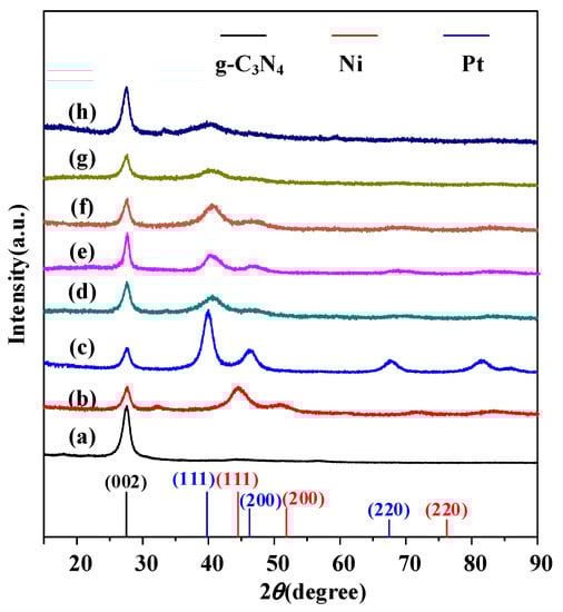 XRD patterns of PtNi/g-C3N4 composites with different molar ratio of PtNi: (a) g-C3N4, (b) Ni/g-C3N4, (c) Pt/g-C3N4, (d) Pt0.8Ni0.2/g-C3N4, (e) Pt0.6Ni0.4/g-C3N4, (f) Pt0.5Ni0.5/g-C3N4, (g) Pt0.4Ni0.6/g-C3N4, and (h) Pt0.2Ni0.8/g-C3N4.