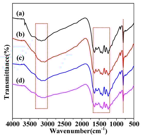 FT-IR spectra of (a) g-C3N4, (b) Pt/g-C3N4, (c) Ni/g-C3N4, and (d) Pt0.5Ni0.5/g-C3N4.