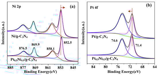To gain the valence state of Pt and Ni, X-ray photoelectron spectroscopy (XPS) analysis was employed for Pt0.5Ni0.5/g-C3N4, and the result is illustrated in Figure 3, which presents the characteristic peaks for Pt and Ni, thus implying the coexistence of both metals. The binding energy (BE) of C and N in Pt0.5Ni0.5/g-C3N4 were in accordance with the previous reported literatures about g-C3N4 (Figure S2) [,,]. As given in Figure 3a, the BE observed at 852.5 and 869.9 eV were ascribed to the Ni 2p3/2 and Ni 2p1/2 of metallic Ni, respectively. The oxidized Ni centered at 858.1 and 876.5 eV were detected, which might likely attribute to the partial oxidation of Ni during the sample treatment route for the XPS measurements, as revealed before [,,]. The BE of 71.4 and 74.6 eV in Figure 3b corresponded to the Pt 4f7/2 and Pt 4f5/2 of metallic Pt. In addition, there was a positive shift toward 0.1 eV for the BE of Pt in Pt0.5Ni0.5/g-C3N4 compared with that of pure Pt, while a negative shift with 0.4 eV could be observed for Ni in Pt0.5Ni0.5/g-C3N4 in comparison with that of pure Ni, thereby confirming the formation of the PtNi alloy, which was in good agreement with those of alloys previously reported [,,,,,].