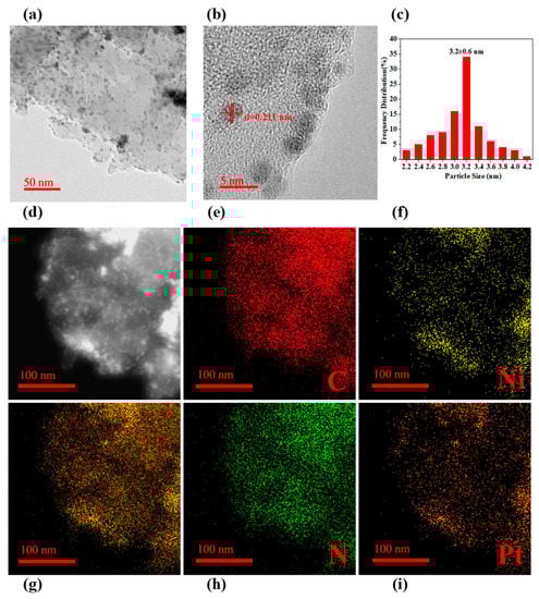 (a) TEM images of Pt0.5Ni0.5/g-C3N4, (b) amplified High Resolution Transmission Electron Microscopy (HRTEM) image of Pt0.5Ni0.5/g-C3N4, (c) particle size distribution of Pt0.5Ni0.5 NPs, (d) high-angle annular dark-field scanning TEM (HAADF-STEM) image, and (g) mix distribution of C, N, Ni, and Pt of Pt0.5Ni0.5/g-C3N4, (e,f,h,i) C, Ni, N, and Pt elemental mapping images of Pt0.5Ni0.5/g-C3N4.