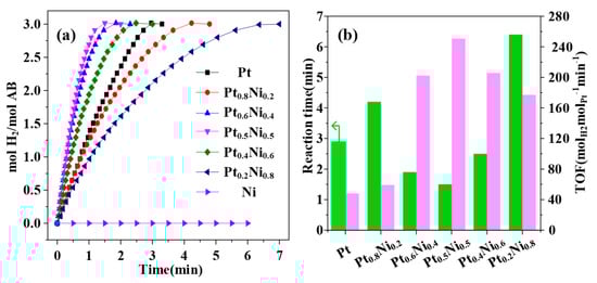 Figure 5a presents the hydrogen release from AB catalyzed by PtxNi1-x/g-C3N4 catalyst with different components. Among all the PtxNi1-x/g-C3N4 conducted, Pt0.5Ni0.5/g-C3N4 revealed optimum catalytic performance towards the dehydrogenation of AB in comparison with that of another molar ratio of PtxNi1-x/g-C3N4. The hydrogen production from AB hydrolysis dehydrogenation over Pt0.5Ni0.5/g-C3N4 could be completed within only 1.5 min, giving a TOF value of 250.8 molH2 min−1 (molPt)−1 (Figure 5b), which was the highest as compared with other as-prepared PtNi alloy catalysts, as well higher than most reported Pt-based or other noble metal-based catalysts towards the hydrogen evolution of AB hydrolysis dehydrogenation as displayed in Table 1 [,,,,,,,,]. The results showed that the platinum coupling with nickel could significantly improve the hydrolytic activity of AB. The superior catalytic performance of the Pt0.5Ni0.5/g-C3N4 can be ascribed to the synergetic effect between Pt and Ni atoms as well as the enhanced interaction between PtNi NPs and g-C3N4.