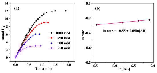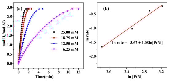 Given that Pt0.5Ni0.5/g-C3N4 demonstrated the best catalytic performance towards the dehydrogenation of AB in this work, Pt0.5Ni0.5/g-C3N4, as the representative, was selected to further explore its dehydrogenation kinetics. As illustrated in Figure 6a, the catalyst concentrations-dependent test of Pt0.5Ni0.5 NPs was investigated at 10 °C by modifying the catalyst concentration ranging from 6.25 to 25 mM. The hydrogen generation rate demonstrated an obvious upward tendency with the increasing of catalyst concentrations. The relation between logarithmic plots of dehydrogenation rate and catalyst concentrations is illustrated in Figure 6b. The slope of straight line was estimated to be 1.08, implying that the dehydrogenation reaction was first-order in terms of the catalyst concentration. Furthermore, to explore the influence of AB concentration on the dehydrogenation of AB, a series of experiments with different concentrations of AB were performed, where the AB concentrations were modulated from 250 to 1000 mM, as shown in Figure 6a, and Pt0.5Ni0.5/g-C3N4 NPs was kept at 0.100 g. Figure 7a shows corresponding hydrogen amount versus time. As the concentration of AB increased, the dehydrogenation reaction time increased clearly from 0.8 to 1.5 min. Figure 7b displays logarithmic plots of dehydrogenation rate versus AB concentrations, where the line slope was 0.05, suggesting that the dehydrogenation reaction of AB presents zero-order regarding the catalyst concentrations.