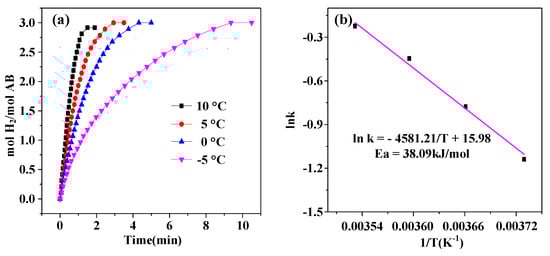 To explore the influence of temperature, the AB concentration was maintained at 1000 mM and the Pt0.5Ni0.5/g-C3N4 was kept at 0.100 g. Plot of the molar ratio of H2/AB versus time for hydrogen evolution from AB catalyzed by Pt0.5Ni0.5/g-C3N4 catalyst at different temperatures are presented in Figure 8a. As the reaction temperature changed from −5 to 10 °C, the dehydrogenation rate significantly increased. According to the slop of the straight line in Figure 8b, the activation energy was estimated to be 38.09 kJ/mol, which was lower than most of the reported Ea values of many different Pt-based and some other catalysts [,,,,,,].