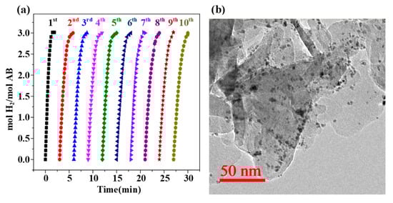 (a) Durability test of Pt0.5Ni0.5/g-C3N4 in ten runs for hydrogen generation from hydrolysis of aqueous AB solution, and (b) TEM image of Pt0.5Ni0.5/g-C3N4 after ten cycles.